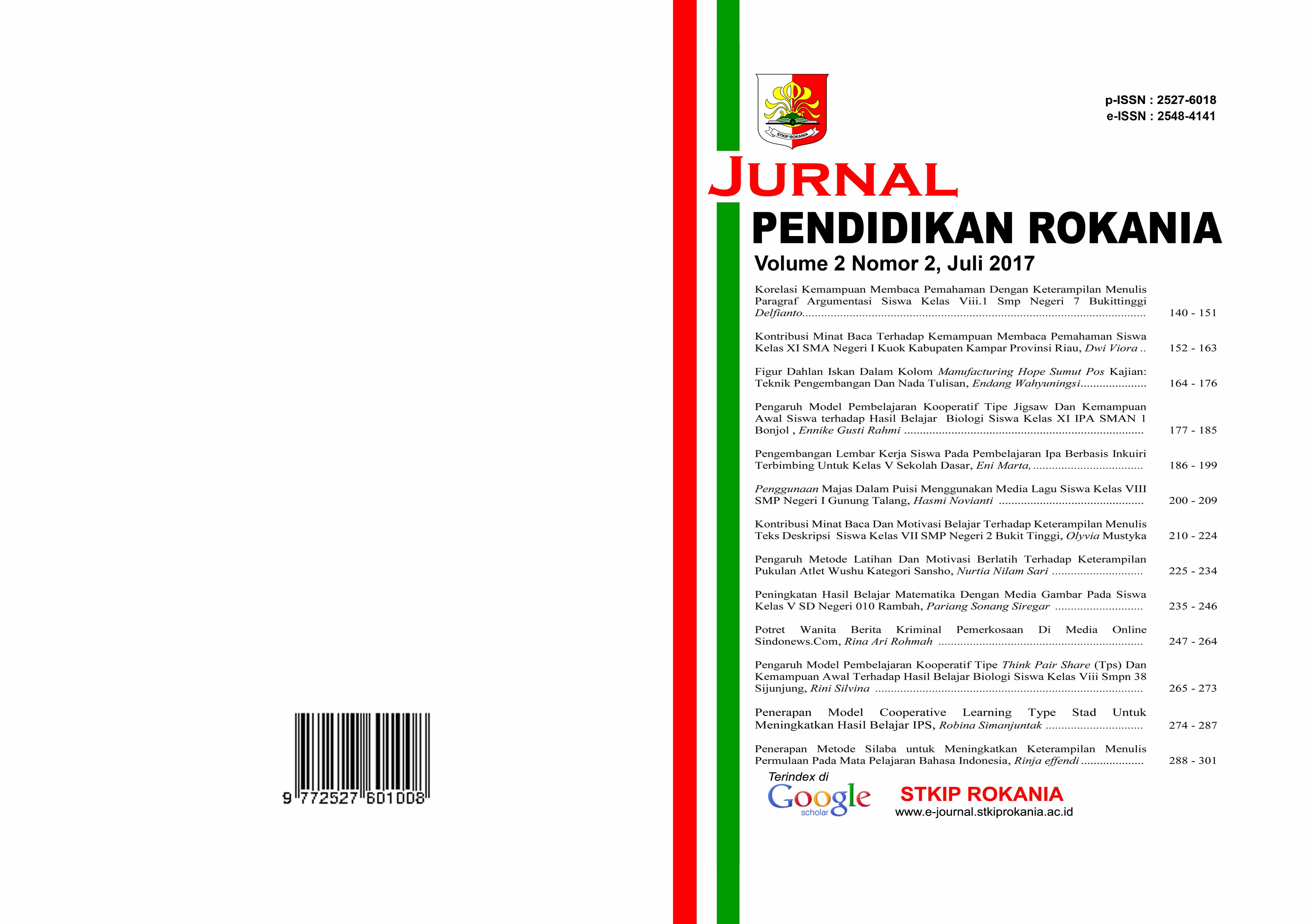JURNAL PENDIDIKAN ROKANIA merupakan jurnal ilmiah penelitian pendidikan dan pembelajaran yang diterbitkan Lembaga Penelitian dan Pengabdian kepada Masyarakat Sekolah Tinggi Keguruan dan Ilmu Pendidikan (STKIP) Rokania, yang terbit dua kali dalam setahun pada bulan Maret, Juli dan Nopember. Artikel yang masuk akan dievaluasi dan disunting sesuai format yang telah ditetapkan tanpa mengubah maksud tertentu